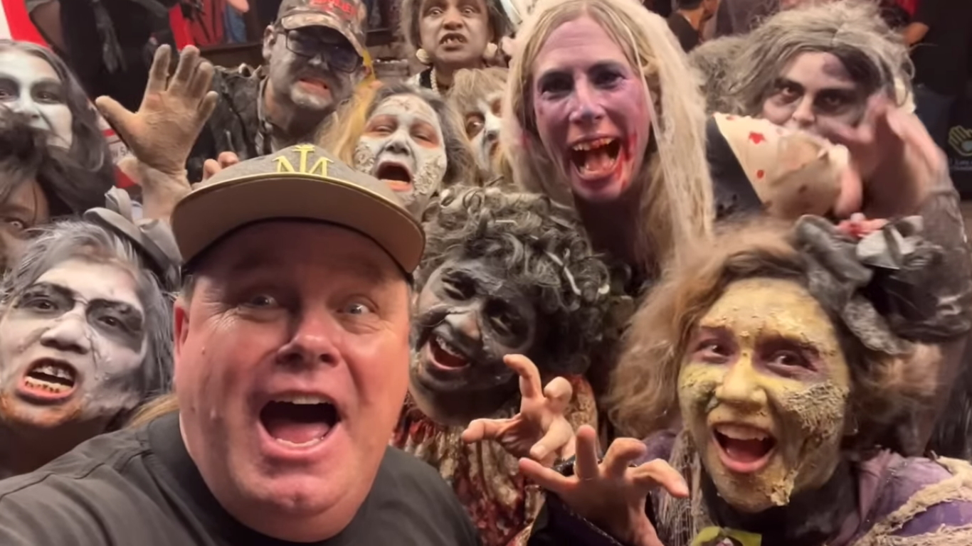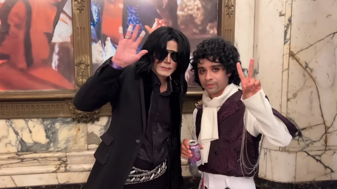 Большинство гостей, конечно же, были одеты в майклостиле, но, поскольку мероприятие всё-таки приурочено к Хэллоуину, то были и гости в других костюмах. Больше всего меня повеселил парень в образе певца Принса Это ну очень забавно смотрелось! ))) Автор ролика тоже не удержался и подколол его - ну, мол, что ты тут делаешь, парень, ты не должен быть здесь)))) А какие исторические кадры можно было сделать, вы только посмотрите!