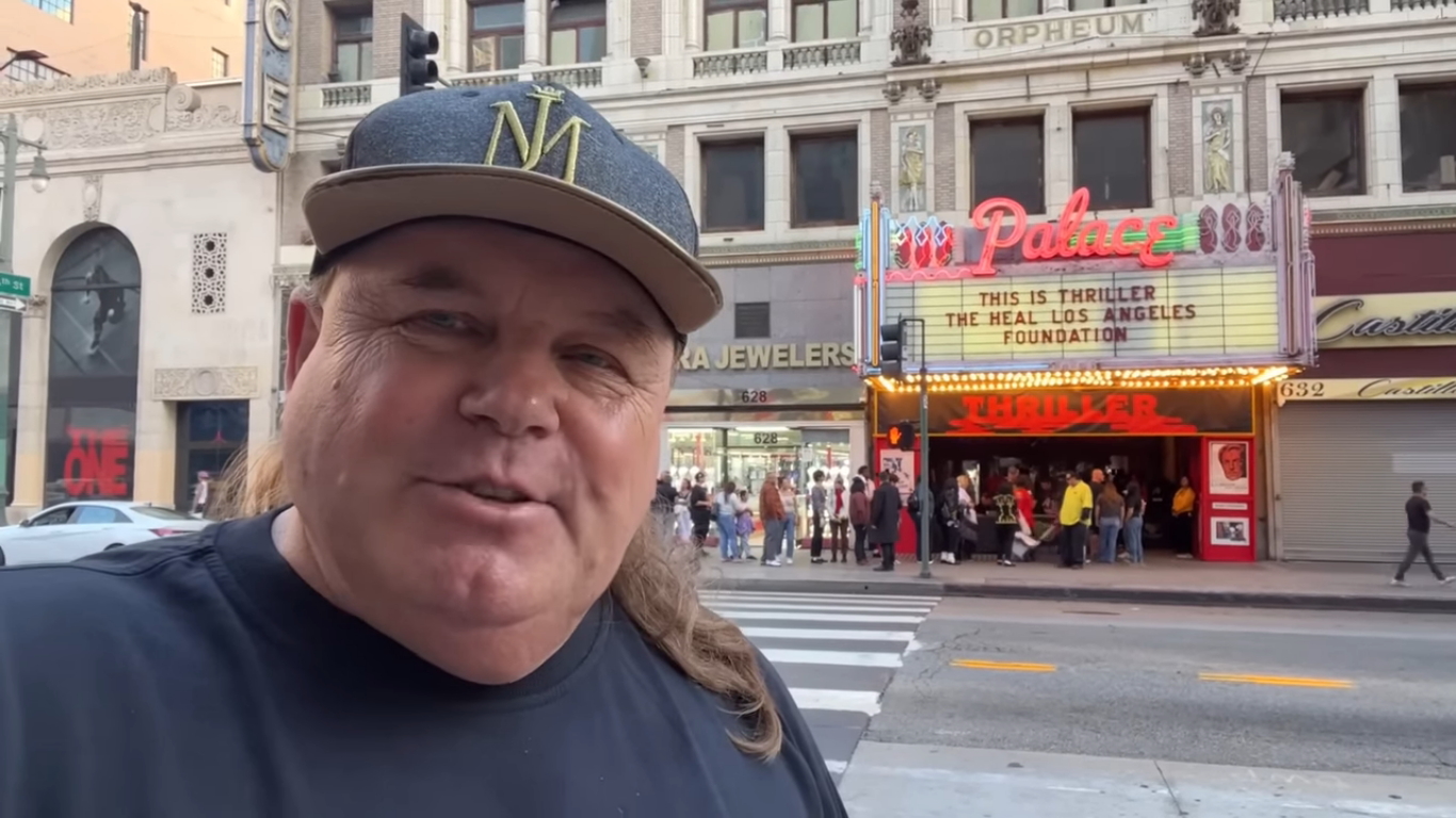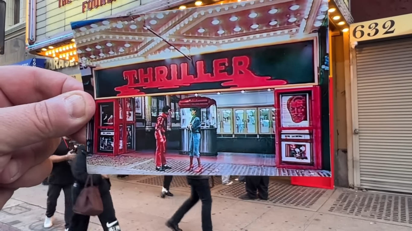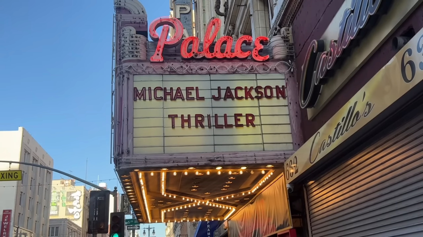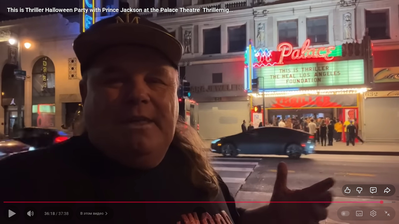 Весь фокус вечеринки был в том, что проходила она в том самом колоритном кинотеатре, в котором снимался "Триллер" Мне как-то попадались всякие ролики про места съёмок "Триллера", и на них кинотеатр выглядел несколько заброшенно. Он то ли открывался только для каких-то специальных мероприятий, то ли вообще пустовал. А тут, благодаря Принсу и Томасу, сказка ожила! Снова засверкали огоньки, появилась афиша, и все собравшиеся там поклонники затрепетали! Да что уж там, даже через экран ощущается какое-то волшебство!!!