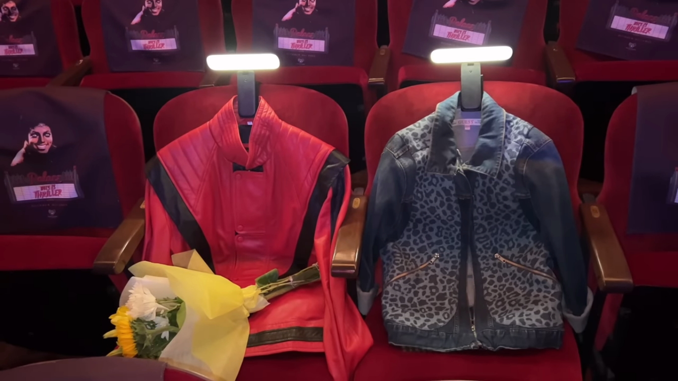 А в самом зале оставили два места - те, на которых сидели персонажи Майкла и Олы Рэй, - свободными, положив на них их куртки и букет цветов Фишкой мероприятия стало вручение почётным гостям сувенирной триллер-куртки и букета после кинопоказа.