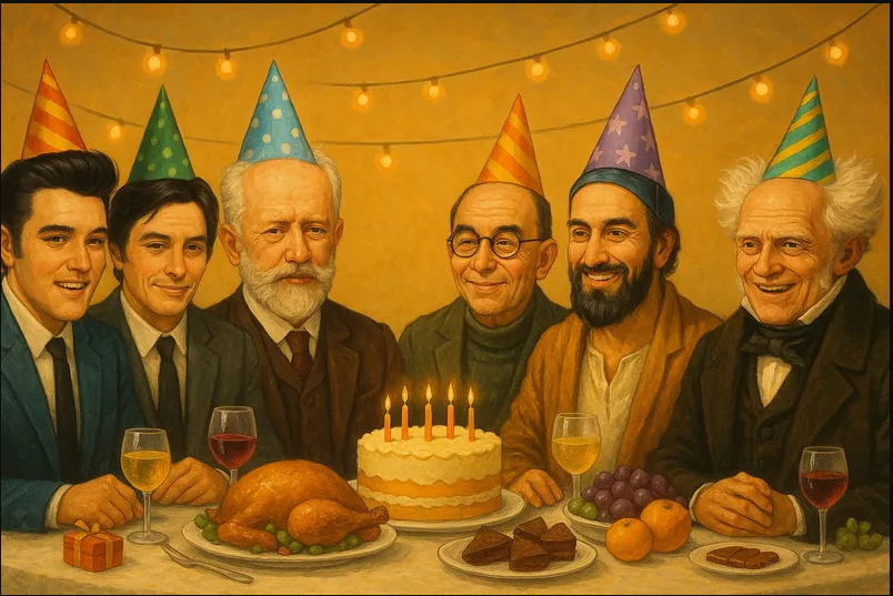 Также мне любопытно, почему Элвису он подобрал столь скучный, как сейчас говорят, аутфит? И в конце концов... почему у Алена и Петра Ильича настолько разный размер голов???